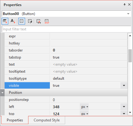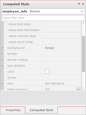 プロパティウィンドウの下部タブで[Computed Style]項目を選択すると、テーマ、CSS、Styleプロパティが処理されて、実際の画面に適用するスタイルプロパティ値が表示されます。以下の項目でbackground項目は、他のプロパティ値よりも太字で表示され、このような項目はプロパティウィンドウで該当プロパティ値を直接変更した場合です。