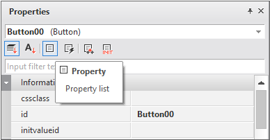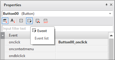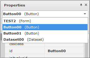 編集中のフォームが持つ全てのコンポーネント、Datasetなどをid値(オブジェクト名)でリストに表示します。選択したオブジェクトに応じてそれぞれのプロパティリストやイベントリストが表示されます。デザイン画面で任意のオブジェクトを選択することもできます。