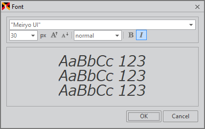 フォント編集ウィンドウでは、フォント、サイズ、スタイルなどのプロパティ値を編集し、適用された状態をあらかじめ確認することができます。