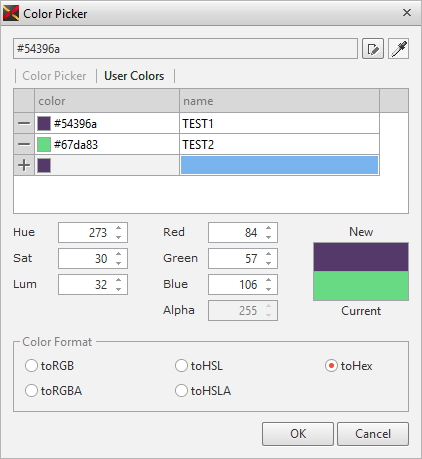 Color Pickerを使用すると、様々な形式でカラー値を指定することができ、User Colorを保存しておいて再使用することができます。