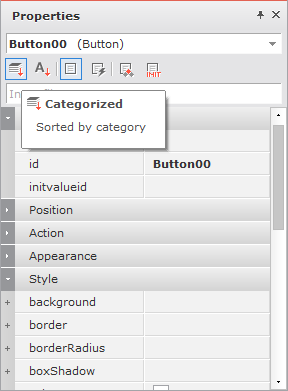 選択したオブジェクトのプロパティやイベントをカテゴリにソートして編集します。編集するときは、下図のように「▶」や「▼」をマウスでクリックして、カテゴリ項目を展開したり折りたたんだりできます。