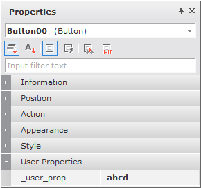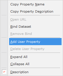 Formを除くすべてのコンポーネントやDatasetには User Property項目を追加することができます。 Propertiesウィンドウからコンテキストメニューを呼び出して、[Add User Property]を選択します。