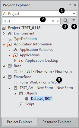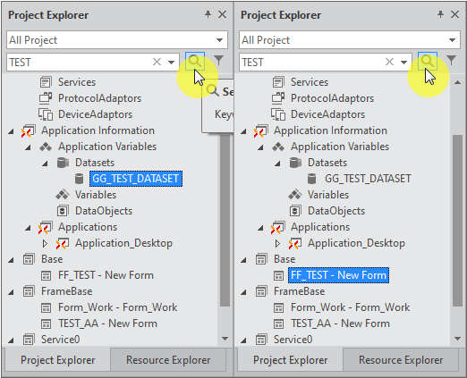 検索ワードとして「TEST」を入力し、検索アイコンをクリックすると、Application VariablesのDatasetオブジェクトとBaseサービス内にあるFormの中で「TEST」が含まれた項目が順番に選択されます。