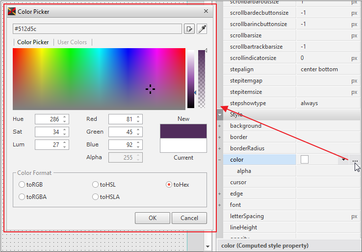 色関連のプロパティ値を選択した場合に色のリストから選択するか、Color Pickerを使用することができます。
