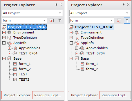プロジェクトの検索とフィルタ機能では、サービスに含まれているフォームファイルを開いていない状態では、フォームファイル名のみ対象に処理され、フォームファイルを開いた後にはフォームに含まれているレイアウトやスクリプト関連のプロパティまで含めて処理されます。