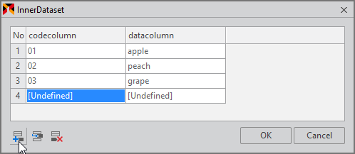 選択したDatasetオブジェクトに対して、innerdatasetプロパティを設定できます。該当のDatasetでのみ使用し、サーバー通信による値の更新が不要などの簡単な値を処理する場合には、innerdatasetを直接編集することができます。Rowを追加・挿入・削除する機能と、codecolumn値やdatacolumn値を設定する機能を提供します。
