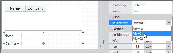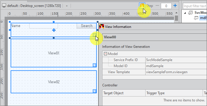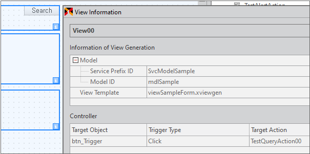 FormデザインウィンドウでViewコンポーネントにModelを接続します。View Generation WizardでView Templateを選択して、View Attributes項目設定ウィンドウで「Layout」としてedittypeを設定した項目(view_layout)の横に表示されるボタンをクリックすると、View Layout Editorを実行できます。