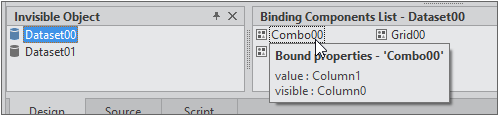 Invisible Objectsウィンドウで選択したDatasetオブジェクトとバインドされたコンポーネントのリストを表示します。リストに表示されたコンポーネントの項目の上にマウスカーソルを置くと、バインディング情報を表示して、コンポーネント項目をダブルクリックすると、デザイン画面で該当コンポーネントにフォーカスを移動します。