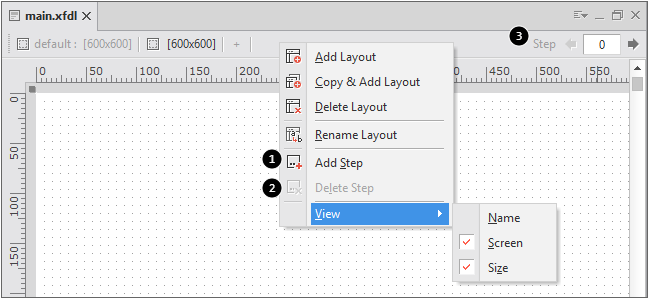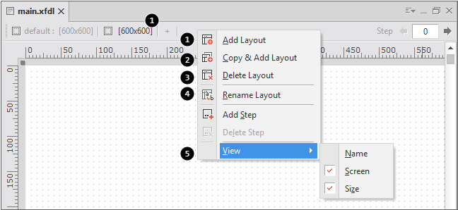 5 | View | レイアウト情報を表示します。 (Name、Screen、Size項目を選択) 「default」レイアウトはName項目を非表示に設定してもdefaultという文字列が表示されます。 |