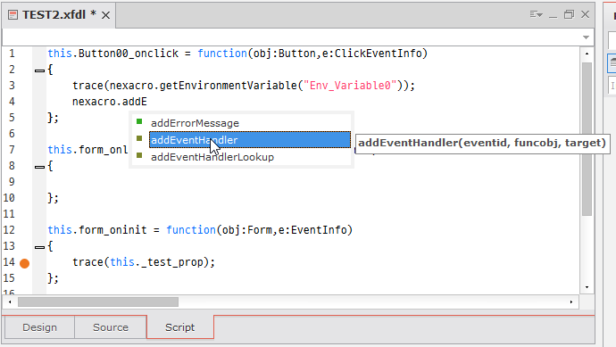 スクリプト内のinclude文を使用して、他のスクリプトを参照する場合には、該当スクリプトファイルを開く機能を提供します。 include文の位置でマウス右クリックしてコンテキストメニューを実行して、[Open Include File - XX.xjs]項目を選択します。