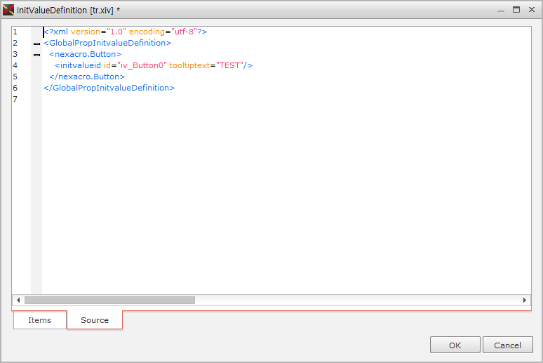 追加されたInitValue項目は、XML形式のファイルとして保存されます。[Source]タブを選択すると、作成されたファイルを確認することができます。