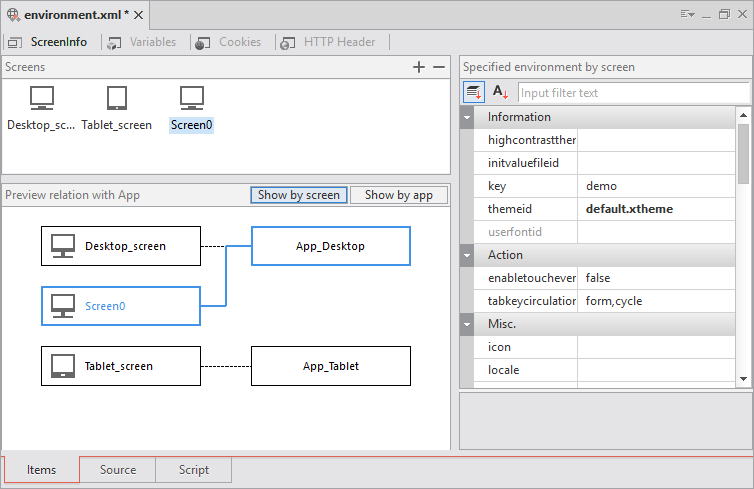 Environmentは、Application Informationとは別に、個々の画面を処理するための設定を定義します。 ScreenDefinition、Variables、Cookiesの項目を指定し、別のスクリプトを作成することができます。
