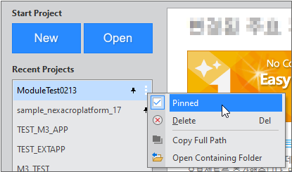 最近のプロジェクトリストから頻繁に使用するプロジェクトは、ピン止めして固定項目として指定することができます。コンテキストメニューから[Pinned]項目をチェック状態に変更するか、プロジェクト名の横に表示されているピンをクリックすると、固定状態に変更することができます。固定項目はすべてのリストから上部に配置されます。