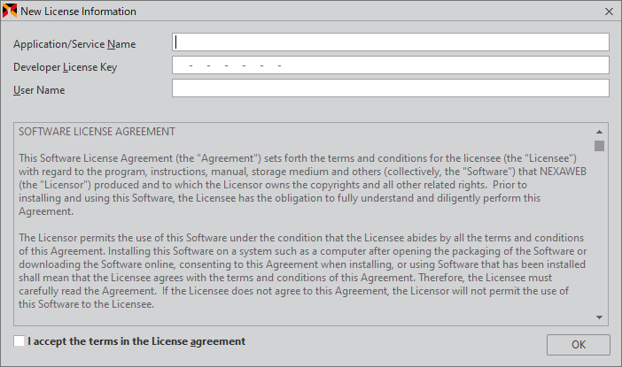 nexacro studioの初回起動時に下記のようなライセンス認証画面が表示されます。ライセンス入力ウィンドウには、「Application/Service Name」と「Developer License Key」の2つの項目を入力します。