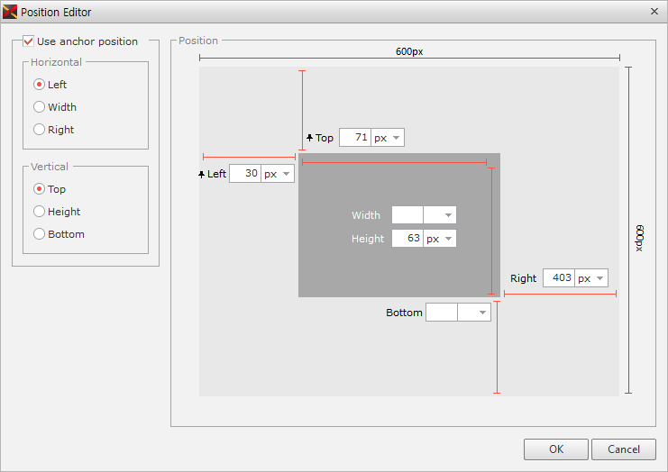 プロパティウィンドウで、Position関連のプロパティの単位はピクセル(px)とパーセント(%)が存在します。各プロパティの単位は、二つに一つのみ選択することができます。プロパティ単位が変更されるとプロパティ値を単位に合わせて自動的に変換します。各プロパティ値は親コンポーネントを基準に設定され、PositionBaseを設定した場合には、該当するコンポーネントを基準に設定されます。