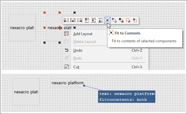 minwidth、minheight、maxwidth、maxheight、fittocontentsプロパティは、アプリの実行時に反映されるプロパティです。nexacro studioのデザインモードで、プロパティ値に基づいてコンポーネントのサイズを変更するには、コンポーネントを選択して、メニューの[Design>Fit to Contents]もしくはツールバーやコンテキストメニューから[Fit to Contents]を選択します。