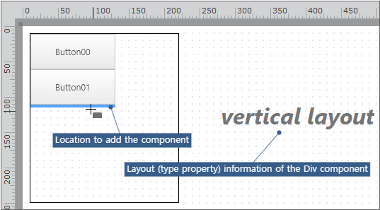 If you select a component to be placed and drag it over the Div component area, the currently selected type property information will be displayed on the design screen and the location where the component will be placed is shown in blue.