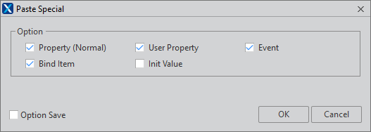 選択されたOption情報のみ適用された状態でコンポーネントを貼り付けます。[OK]ボタンをクリックする前に「Option Save」項目をチェックした場合には、現在選択されたOption情報が[Option > Form Design > Paste Special]に反映されます。