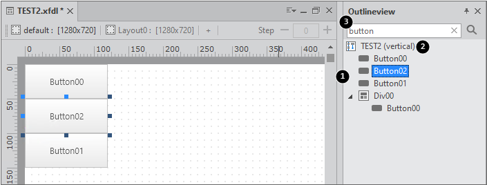 画面上に配置されたコンポーネントの一覧をツリービューで表示します。Viewメニューより Outlineviewを選択し、Form Designモードの場合に動作します。