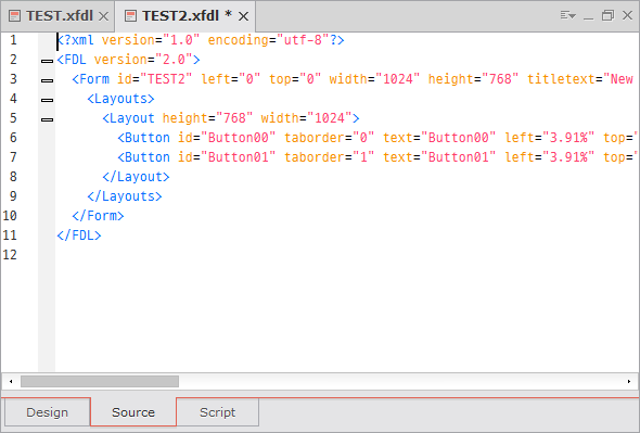 Source編集ウィンドウでは、Formの内容のうち、Script領域を除く全ての内容がXML形態で表示され、表示されたXMLを直接、編集してFormの内容を変更することができます。