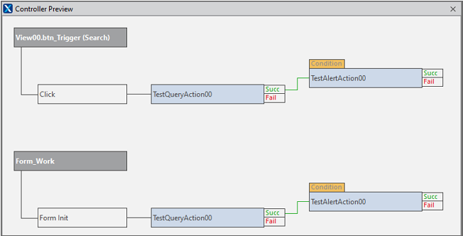 QuickCode Designモードで最初のViewコンポーネントのボタンを選択すると、Controller Previewパネルに追加されたController情報を確認することができます。