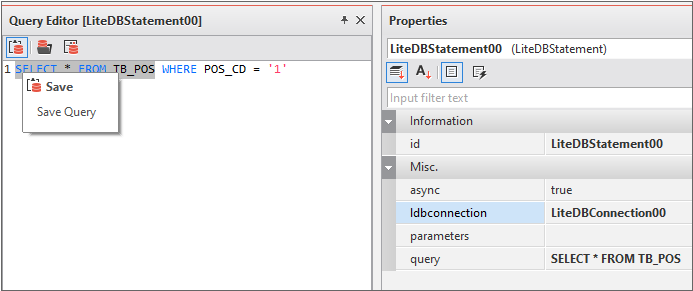 Written queries can be applied as a value of the query property of the LiteDBStatement. If you block-select a certain portion, only the block will be a value of query.