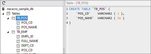 When you select a table, you can see the CREATE TABLE query on the right panel. If you expand a table in the tree view, you can see the columns included by the table. You can select and copy a query but cannot edit it.