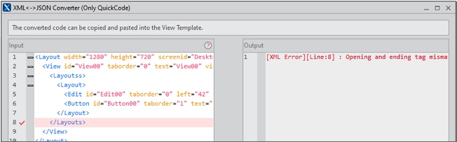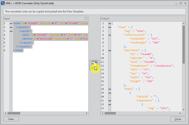 The contents parameter transmitted when calling the fn_GetViewGenerationResult function or the value returned after calling the function is processed in JSON format as shown below. The contents parameter converts the XML code of the current screen to JSON and then transmits it, and the JSON code returned after calling the function is converted to the XML code in Nexacro Studio to be reflected on the screen.