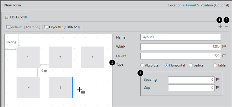 In the Layout item, the layout information to be used in the Form is entered. You can add a layout and set property values according to the Layout Type. When the Layout Type is changed, the list of properties that can be set changes, and an example image that can be used as a reference when setting property values is displayed.