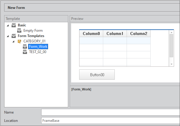 The first step is to determine the name and path of a new Form. You must enter a Form's “Name” and “Location.” A Form file is managed by a service, so you cannot designate paths other than a relevant service as a location of a Form file.