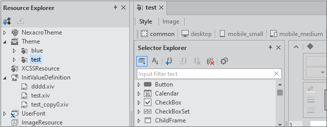 As soon as a theme is created, the corresponding editor view will be opened automatically. A theme file is managed under the Theme directory in the Resource Explorer.