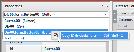 This function copies the ID of a selected component onto the clipboard. For a component that belongs to a Div or Tab component, this function copies the value that includes the IDs of the parent components. You can use this function in three ways: by accessing the menu [Edit > Copy ID (Include Parent)]; by right-clicking a certain component on the Form design pane to open the context menu; and by opening the component list situated at the top of the Properties pane and right-clicking a certain component from the list to open the context menu.