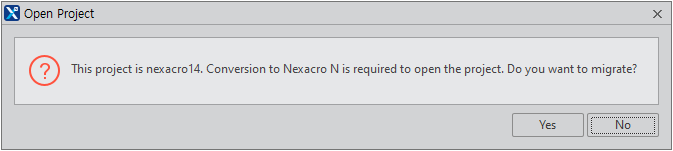 When Nexacro Studio opens an unmigrated project, you will be asked whether you will conduct migration process as presented in the below picture.