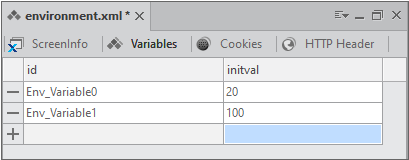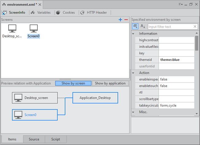 Environment is designed to define the settings for individual screens, existing separately from Application Information. You can specify screen definitions, variables and cookies while you can write the script of an Environment file.
