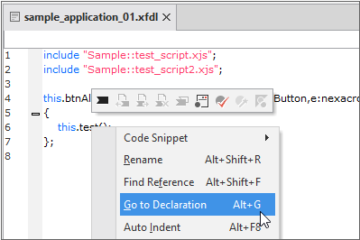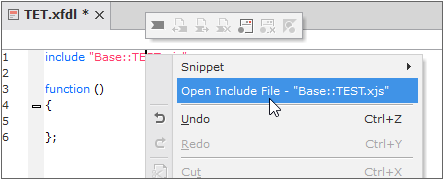 This function will open a script that is referred to in another script through an include statement. Right-click an include statement and select [Open Include File - XX.xjs] from the context menu.