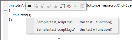 Upon clicking the menu, you will be led to the location where the relevant function is declared. If the function is located in an included script, Nexacro Studio will open the file that the script originates from and bring you to the location of the function. If more than one function are found to have the same name, the list of those functions will be displayed.
