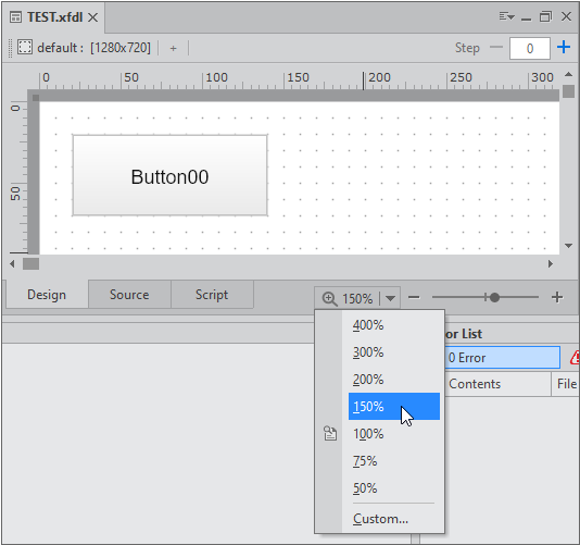 In this tab, you can design components, edit their properties and bind Datasets to them. You can zoom a current form by adjusting the zoom bar on the bottom-right side of the pane.