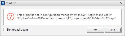 If you change the option of using SVN while working on a project unconnected to the repository, the below dialog box will appear to ask you whether to register the project in the repository. If you click "Yes", Nexacro Studio will begin the process of importing the project to the repository.