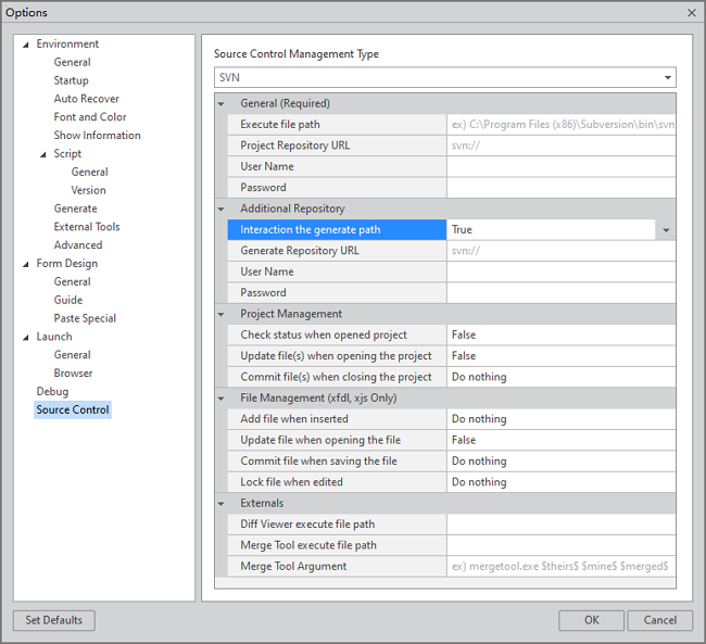 Nexacro Studio supports the following options for the use of Subversion.