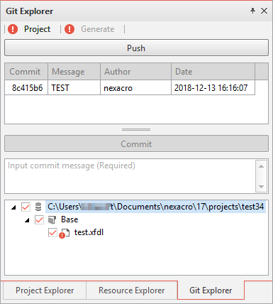 The Git Explorer allows you to see the changes made for a current project and perform necessary tasks. The explorer is largely divided into the Push and Commit sections. If you set the Interact with generate path option to "True", two tabs will appear at the top, dividing the Project and Generate parts.