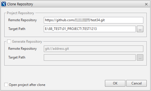 If you set the project repository only, the following pop-up will also present the project repository only. If you set the project repository and generate repository, however, the pop-up will also present both. Folders named after the projects will be automatically created under the directories that were designated as repositories.
