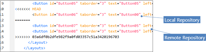 The file with the conflict will be opened with the XML editor of Nexacro Studio. In the below picture, the code written under "HEAD" had been committed in the local repository before the execution of the pull operation. The code written under "=======" is brought from the remote repository. You can resolve the conflict by checking the difference between the two sets of code and making proper changes.