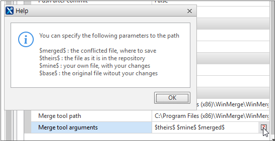 If you designate a merge tool used for the Edit Conflicted command, you should enter the arguments appropriate to each tool. You can see the information on the related placeholders by clicking the question mark icon ([?]) on the right side of the Merge tool arguments option.