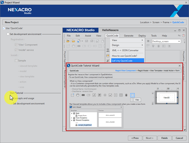 QuickCode 단계에서 [Use 'QuickCode' > Start Tutorial] 항목을 선택하고 [Finish] 버튼을 클릭하면 QuickCode Tutorial Wizard를 실행합니다.