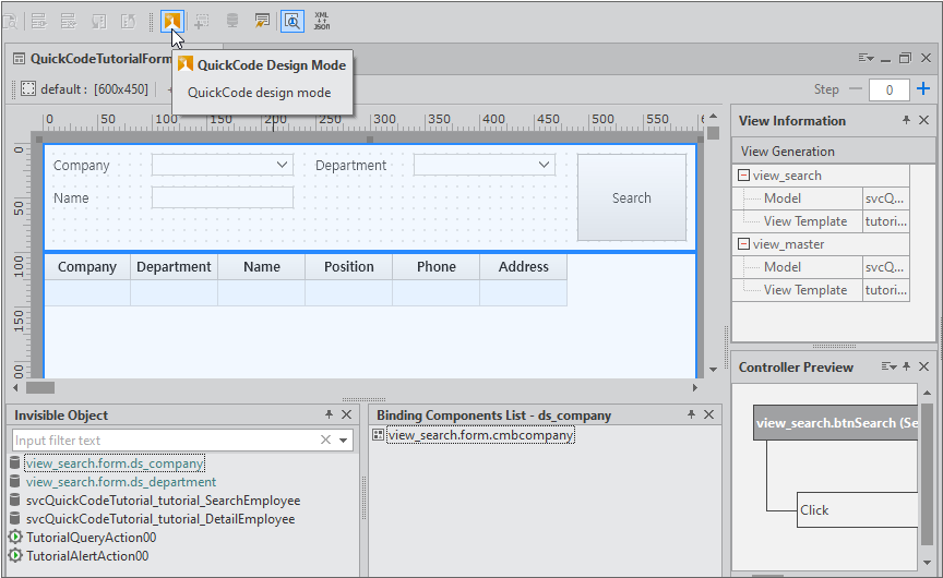 QuickCode Tutorial Wizard 실행 결과로 생성되는 파일이며 QuickView 실행 후 [Search] 버튼 클릭 시 데이터를 조회할 수 있습니다.