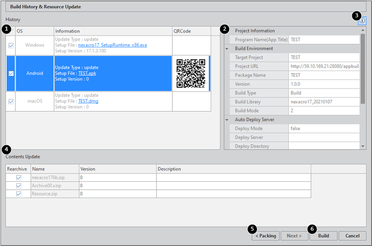 Quick Build Wizard에서는 Build를 진행한 운영체제별 목록을 확인하고 앱을 내려받거나 수정된 Resource 파일의 Version 정보를 수정하고 Build를 진행할 수 있습니다.