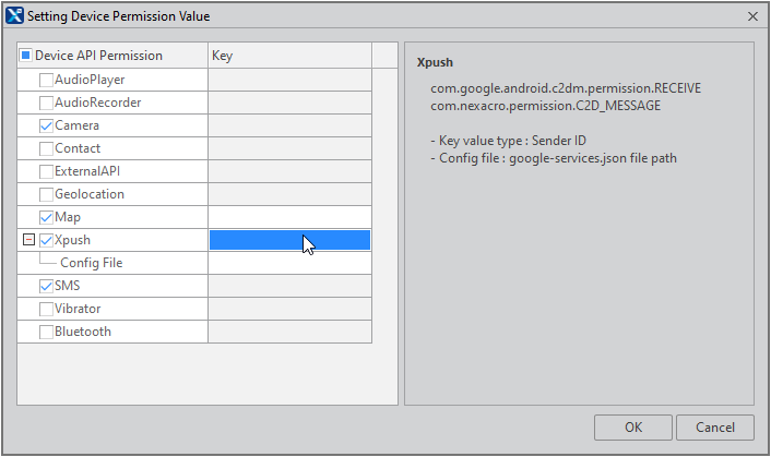 Map, Xpush 권한 지정 시에는 Key값을 입력해주어야 합니다. key값이 없는 경우에 앱이 정상적으로 동작하지 않습니다.