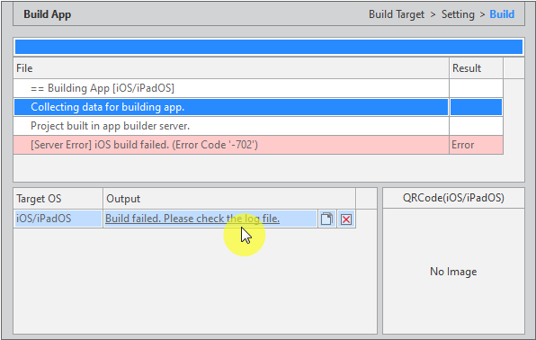 AppBuilder에서 빌드 처리 중 실패한 경우 로그 파일을 확인할 수 있습니다. 빌드 실패 시 설치 파일 링크 대신 로그 파일을 확인할 수 있는 링크를 제공합니다.