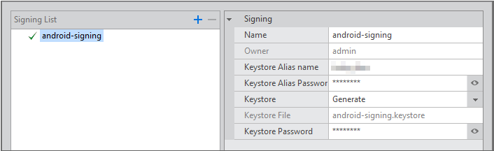 5 | Keystore File | Keystore 파일을 생성하거나 가지고 있는 파일을 등록합니다. - Generate: App Builder에서 Keystore 파일을 생성합니다. - Upload: Keystore 파일을 등록하고 등록된 파일을 표시합니다. 등록된 파일은 링크 형태로 표시되며 링크를 클릭하면 해당 파일을 내려받을 수 있습니다. |