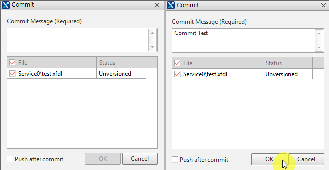 Commit Message를 작성하지 않으면 Commit 할 수 있는 버튼이 활성화되지 않습니다. 메시지 입력 창에 Commit 작업에 대한 설명을 입력해야 합니다.